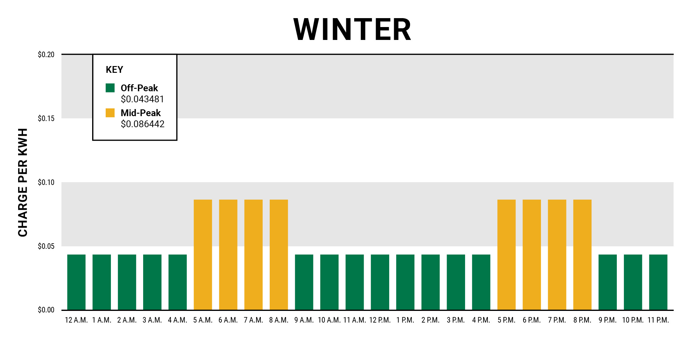 Winter | Off-Peak | 12:01-5 a.m.; 9:01 a.m.-5:00 p.m.; 9:01 p.m.-12 a.m. | $0.043481 |