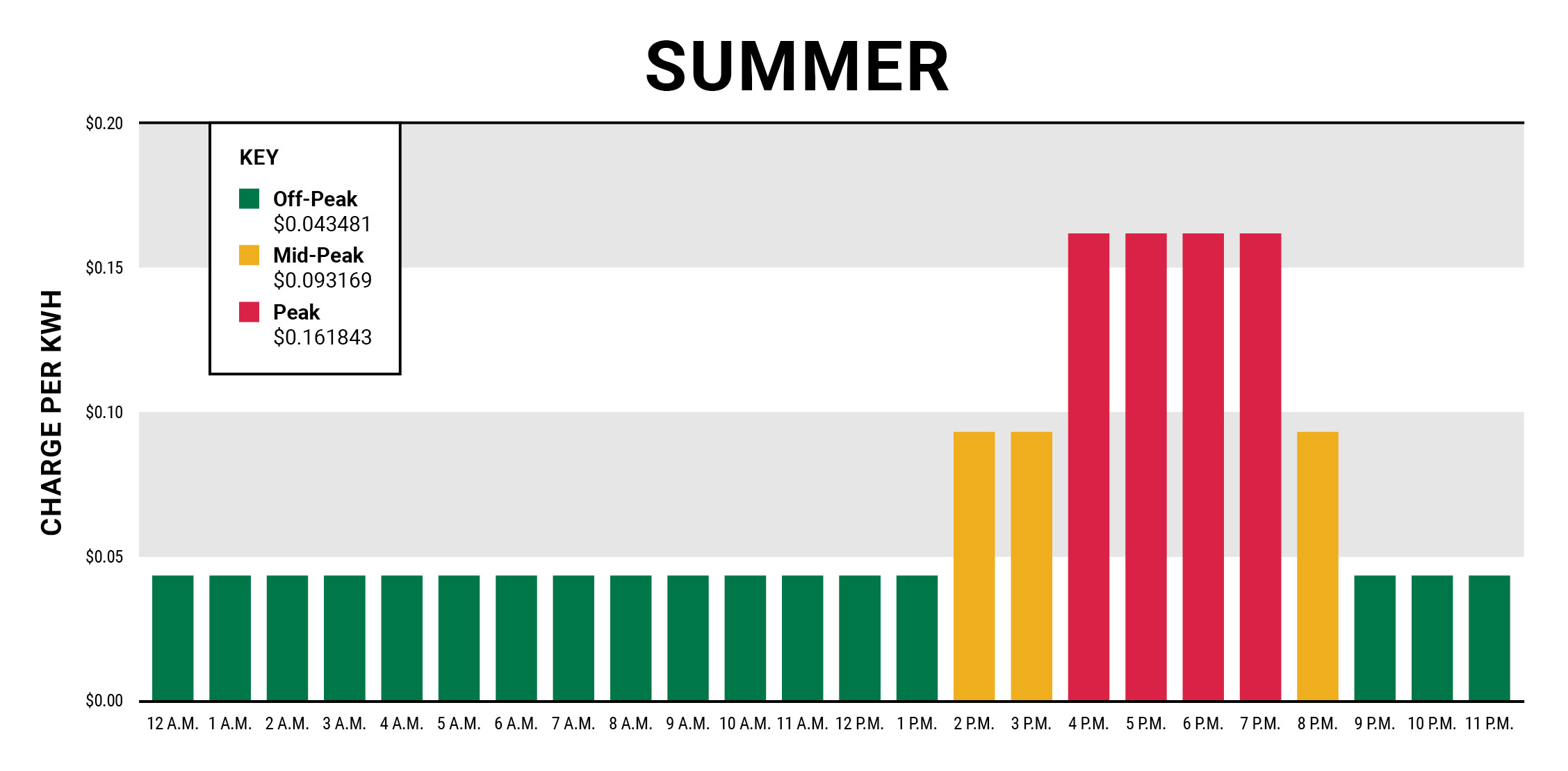 Summer | Off-Peak | 12:01 a.m.-2 p.m.; 9:01 p.m.-12 a.m | $0.043481 |